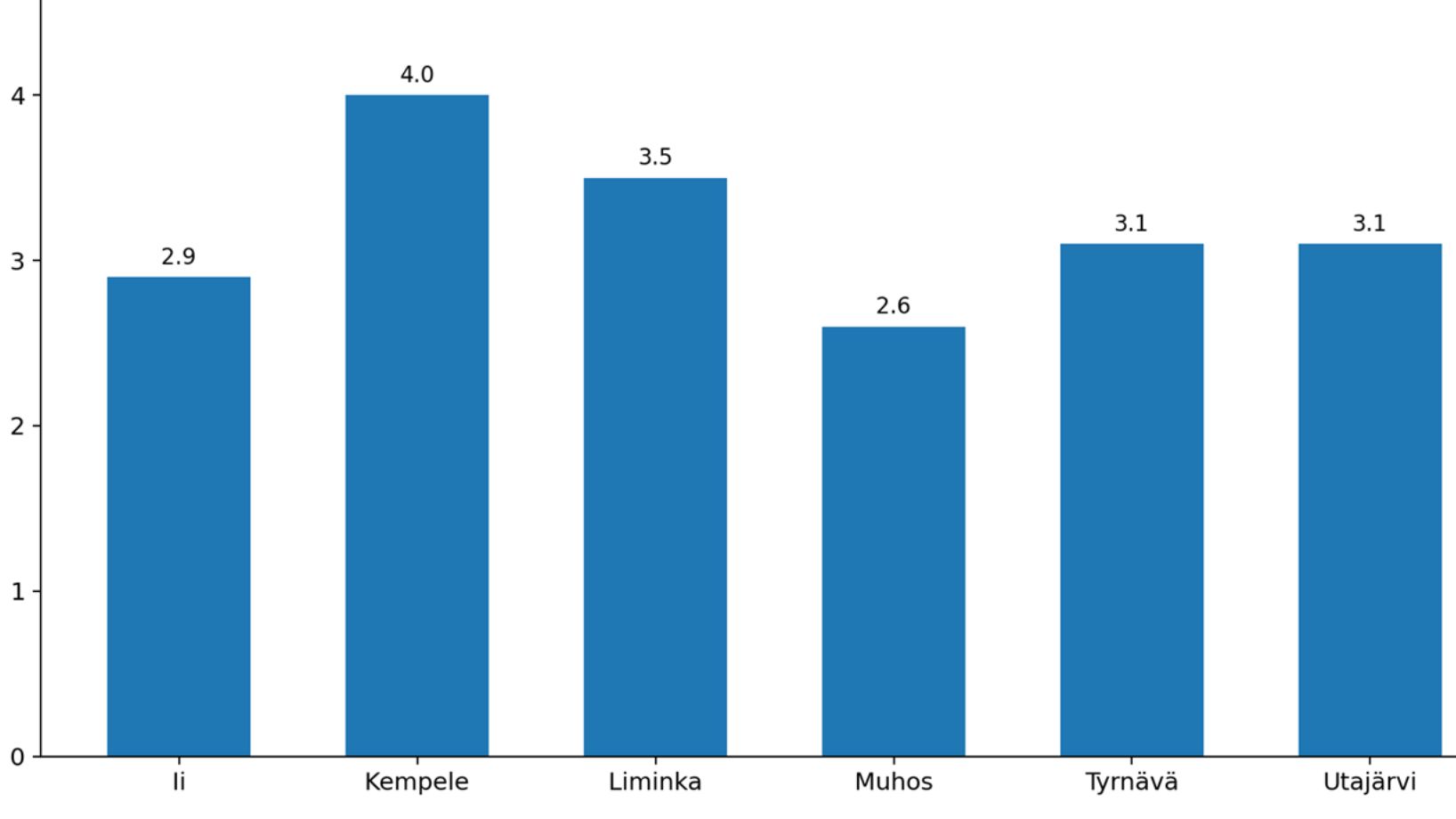 Kyselyn vastausten perusteella lasten ja nuorten mahdollisuudet harrastaa haluamaansa liikuntaa vaihtelivat kunnittain (Kuva1). Parhaimmat mahdollisuudet koettiin Kempeleessä keskiarvolla 4 (1–5) ja Limingassa keskiarvolla 3,5 (1–5), kun taas heikoimmat mahdollisuudet olivat Muhoksella 2,6 (1–5) ja Iissä 2,9 (1–5). Tyrnävällä ja Utajärvellä molemmissa keskiarvot olivat 3,1 (1–5).