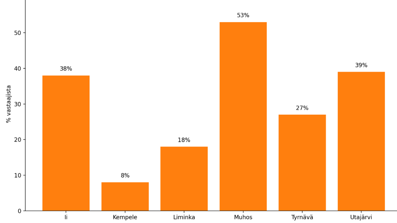 Merkittävä osa vastaajista koki, ettei pysty harrastamaan haluamaansa liikuntaa lainkaan tai pystyy siihen vain rajoitetusti (Kuva2). Vastausten perusteella Muhoksella näin koki jopa 53 % vastaajista. Utajärvellä vastausten perusteella näin koki vastaajista 39 %, Iissä 38 % ja Tyrnävällä 27 %. Limingassa vastaajista näin koki 18 % ja Kempeleessä vain 8 %.